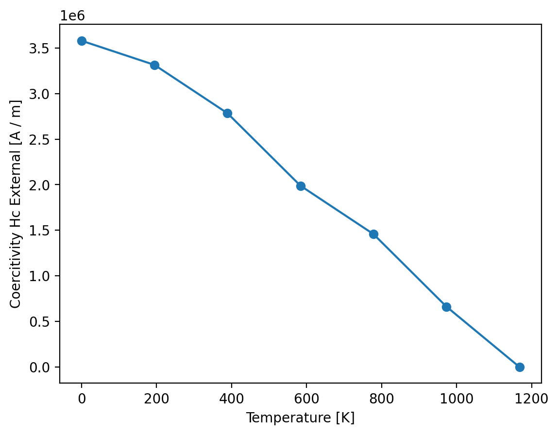 We can now use mammos_analysis.hysteresis as shown before to extract Hc for all simulations and visualize Hc(T):