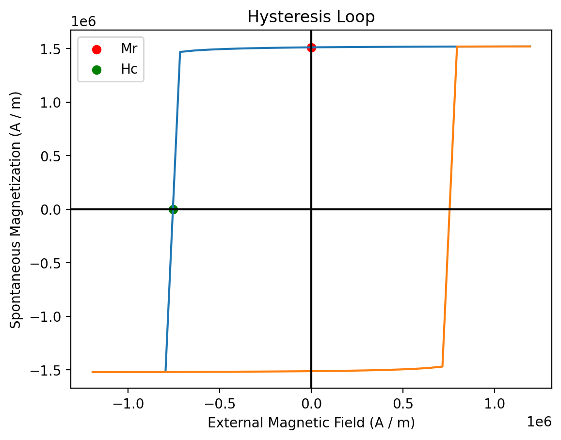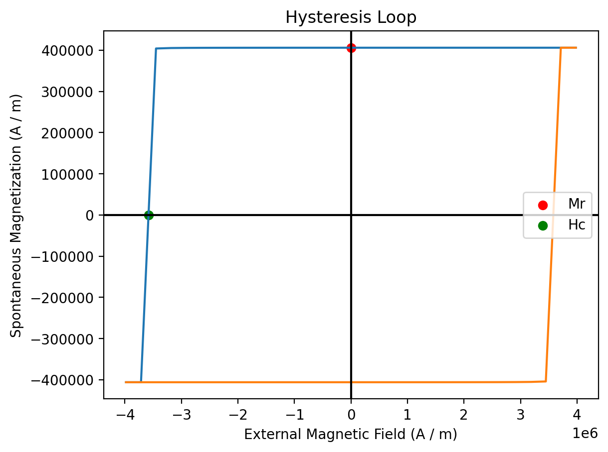 We can combine the results_hysteresis.plot method with some custom code to show Hc and Mr in the hysteresis plot: