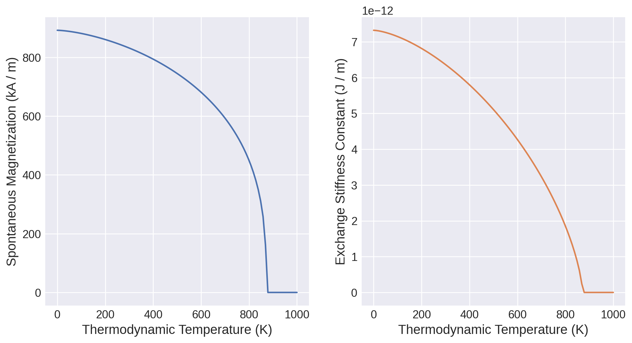 In order to get micromagnetic parameters we use pre-computed data from mammos_spindynamics.db for the temperature-dependent magnetization.