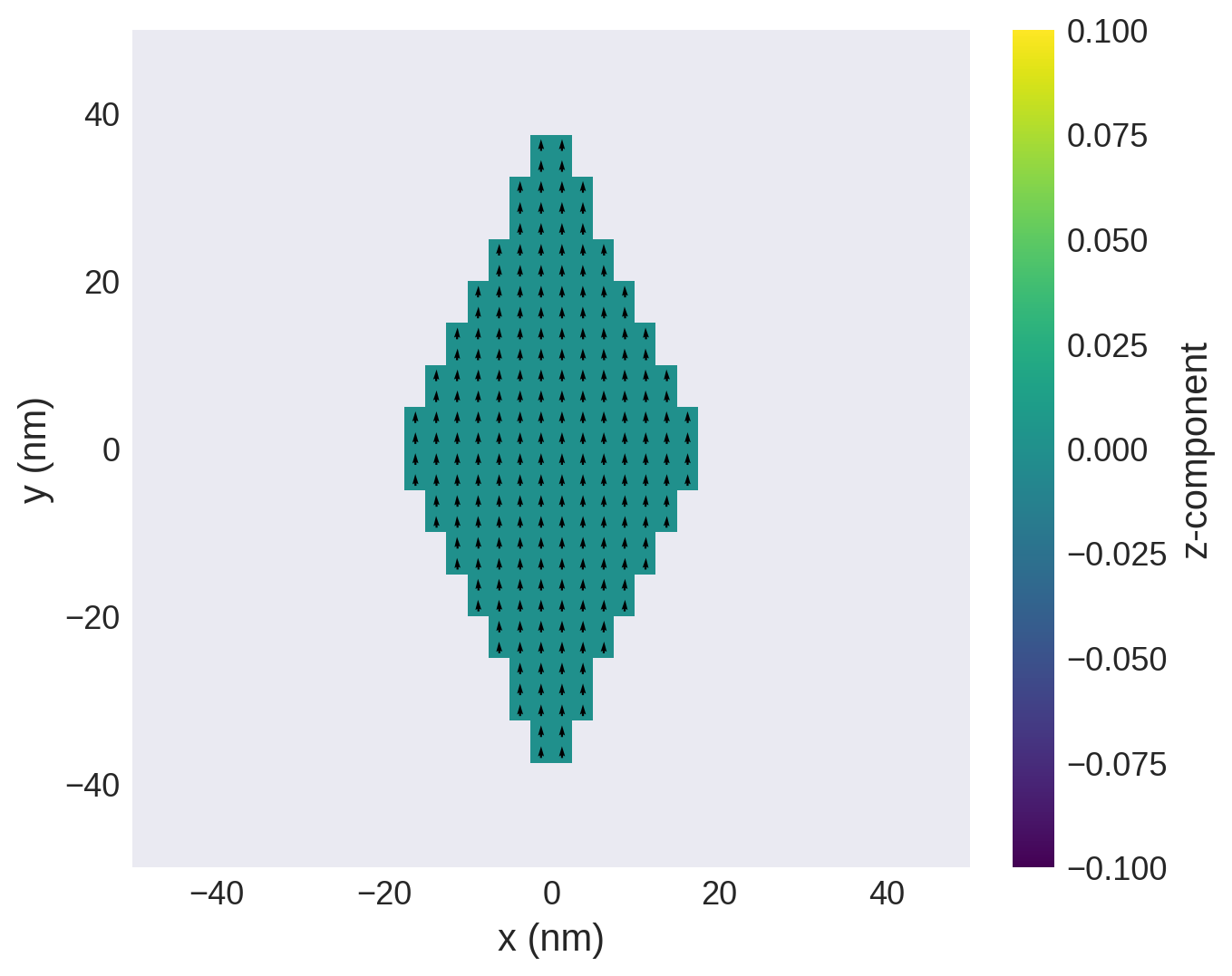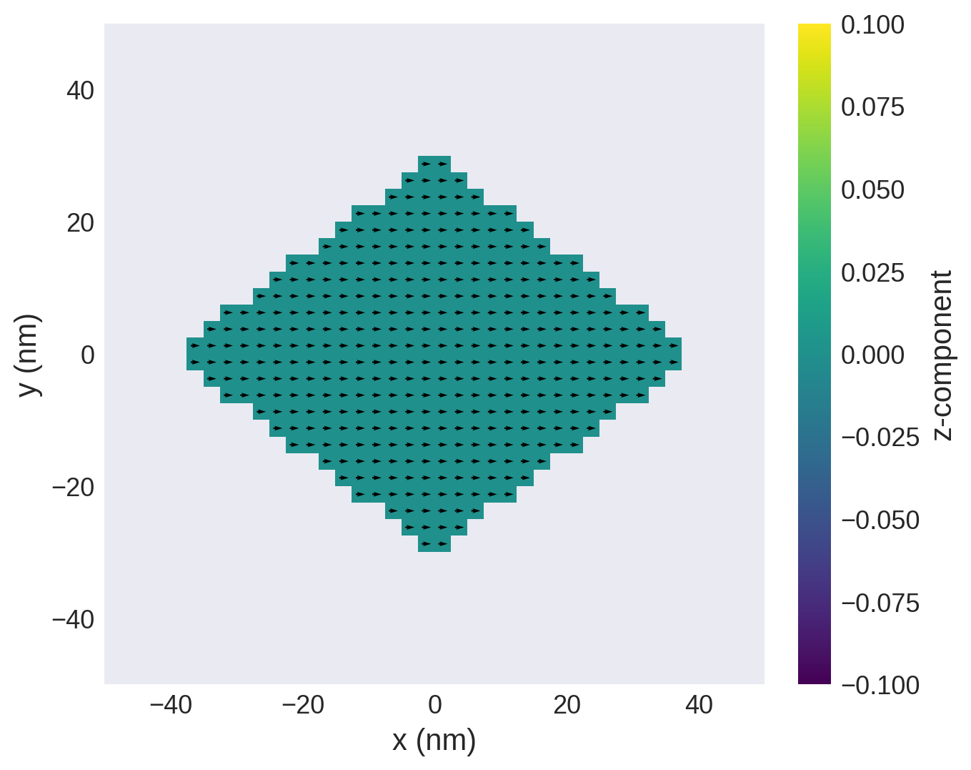system.m = df.Field(mesh, nvdim=3, value=(1, 0, 0), norm=lambda p: in_diamond(p, sx, sy), valid="norm") # Change shape