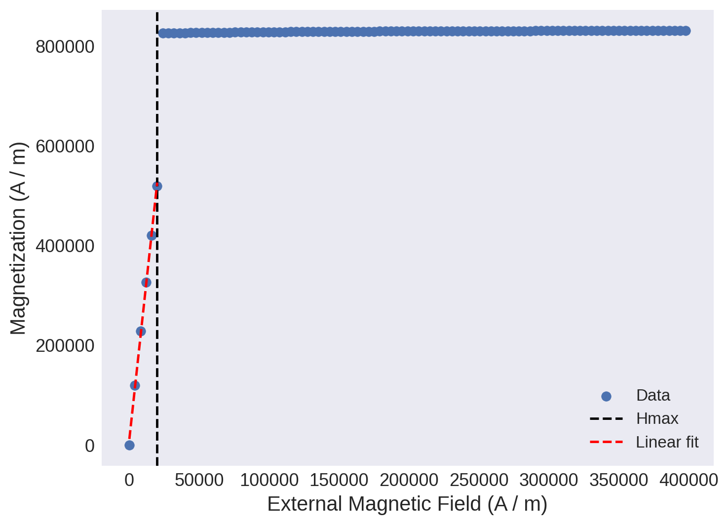 results_linear = mammos_analysis.hysteresis.find_linear_segment(H_y, M_y, margin=0.05 * Ms.q.to("A/m"), min_points=5)